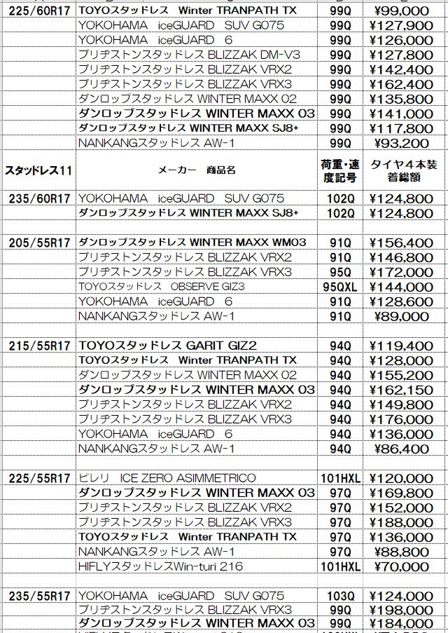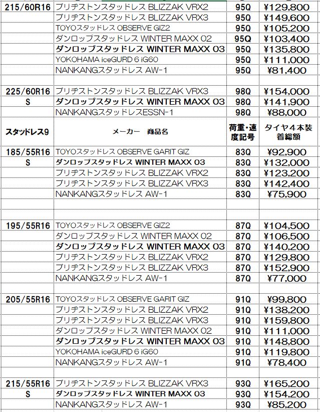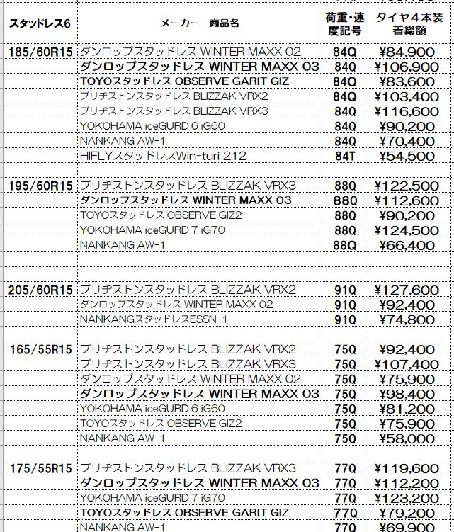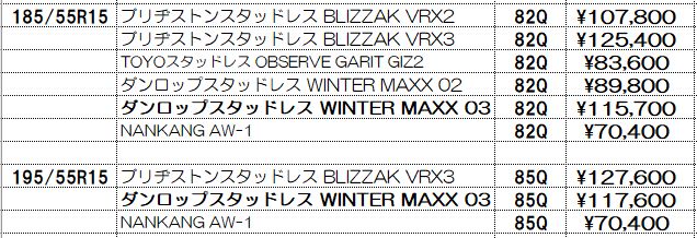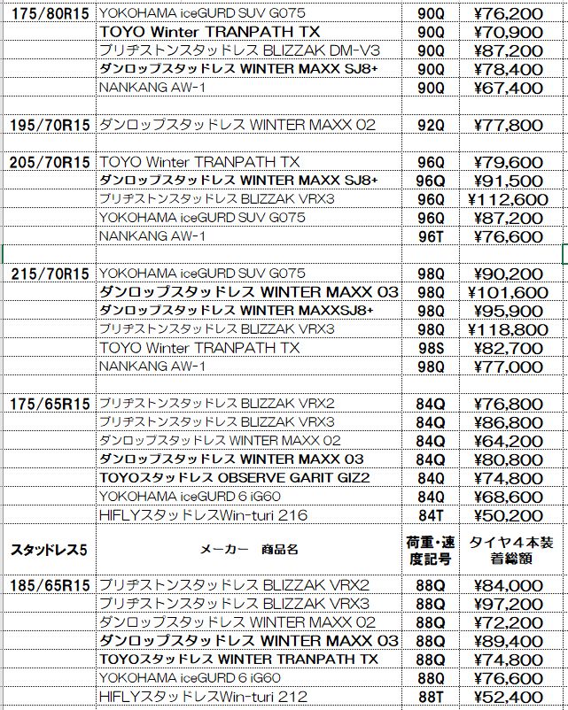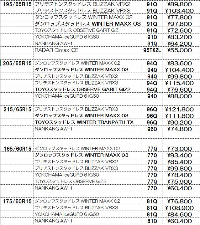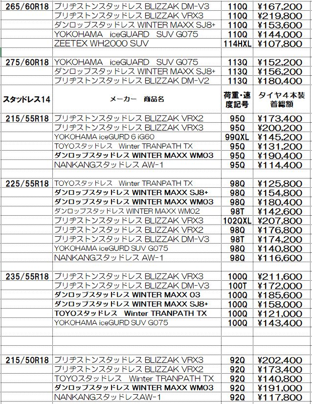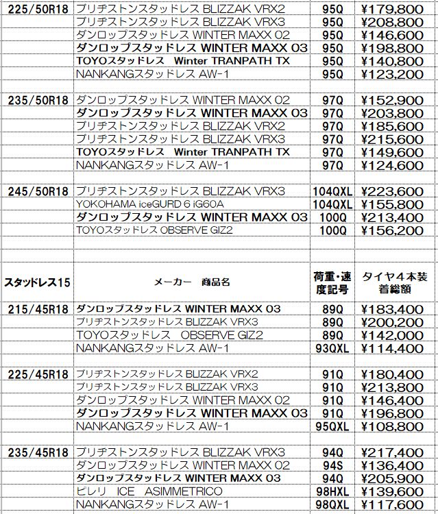 スタッドレスタイヤの価格表示は諸費用込み(廃処分、組み換え、脱着、バランス、タイヤ費用)の価格です。この金額から上がることはないと思っていただいてかまいません!