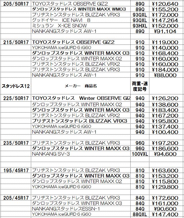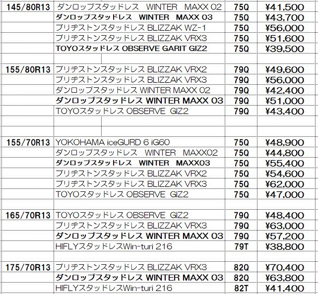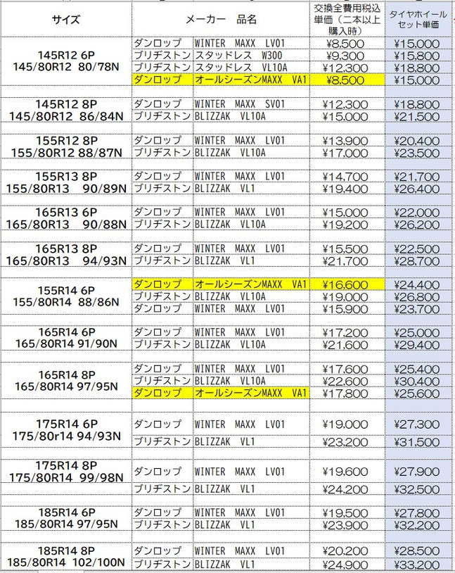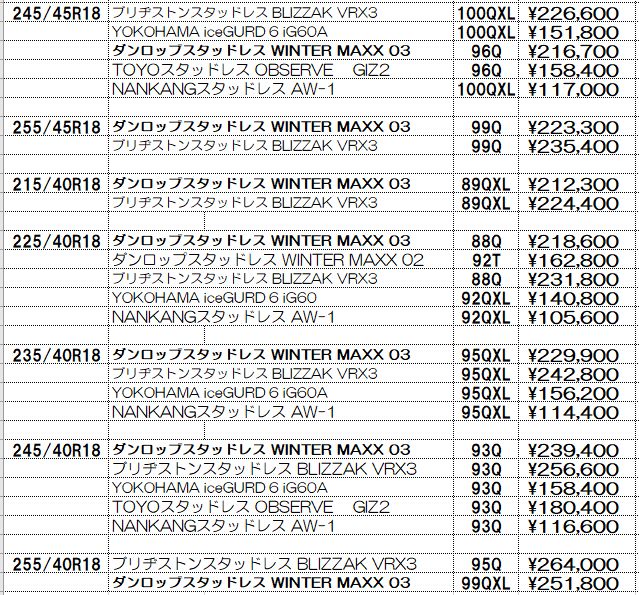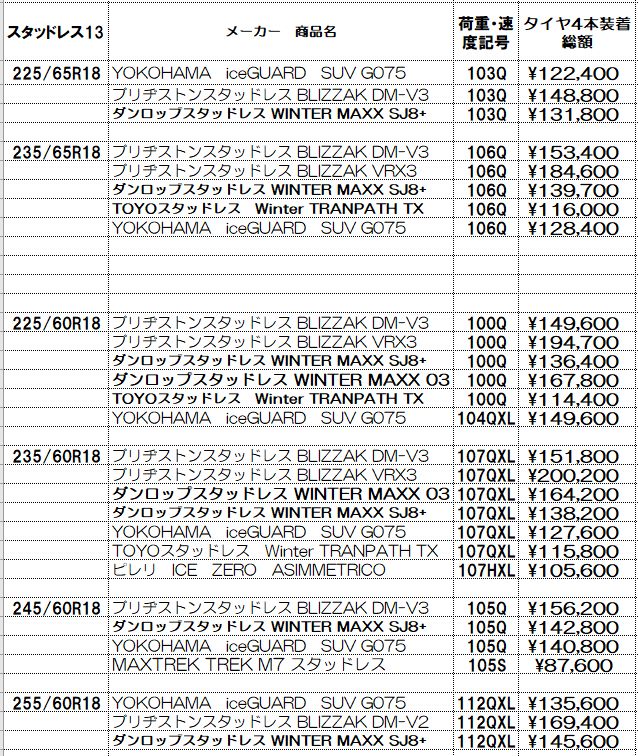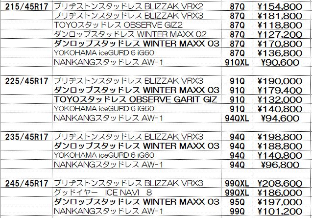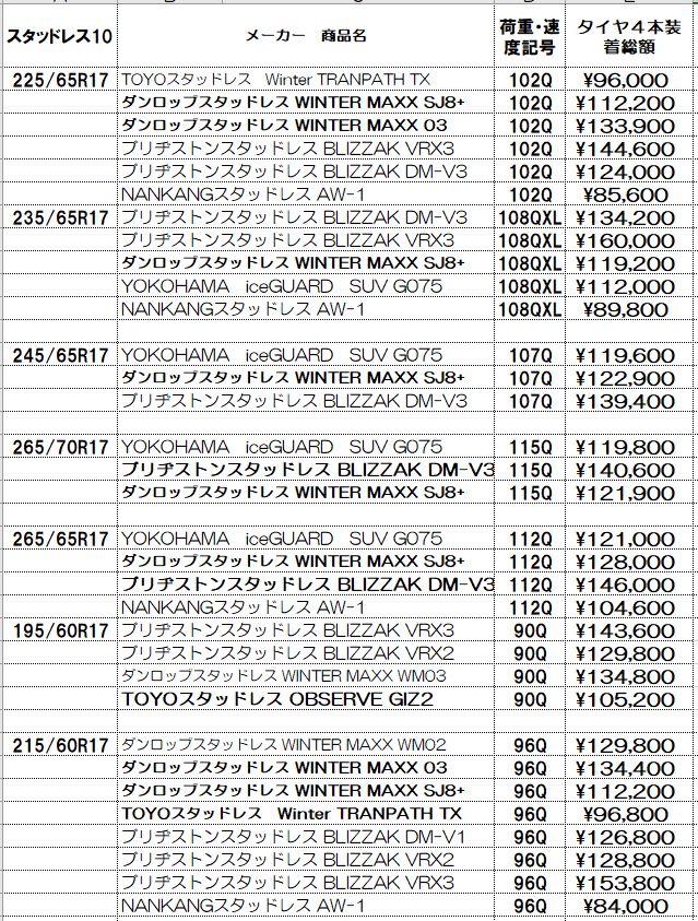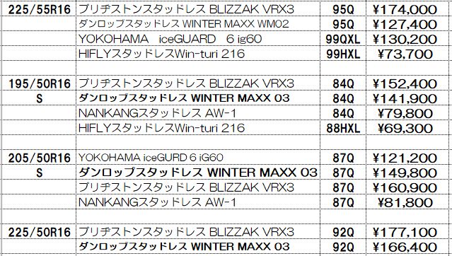 スタッドレスタイヤの価格表示は諸費用込み(廃処分、組み換え、脱着、バランス、タイヤ費用)の価格です。この金額から上がることはないと思っていただいてかまいません!