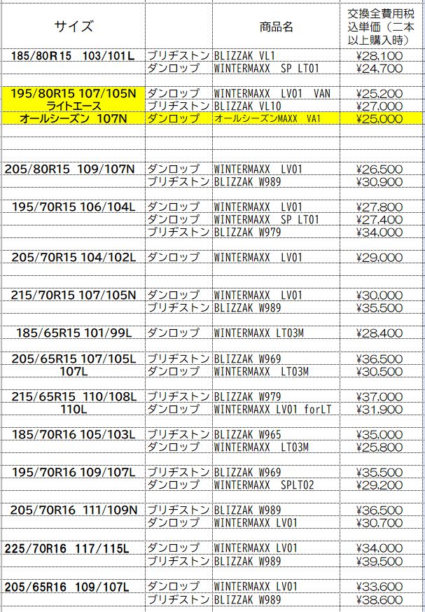 商用車・バン・トラック用スタッドレスタイヤの交換全費用と消費税込みの1本当たりの価格です。 (VENTOアルミホイール)